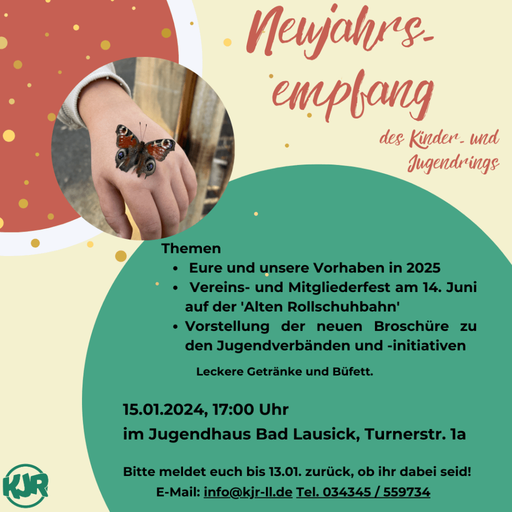 Der Kinder- und Jugendring lädt für den 15.01. ab 17 Uhr zum Neujahrsempfang 2025 ins Jugendhaus Bad Lausick (Turnerstr. 1a) ein.
