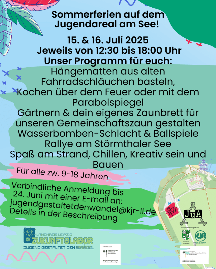 Das Jugendareal am Störmthaler See entwickelt sich weiter – werde auch du ein Teil davon. Jeden Mittwoch gibt es ab 15 Uhr Mitmach-Aktionen sowie in den Ferien am 15. und 16. Juli ein Ferienprogramm.
