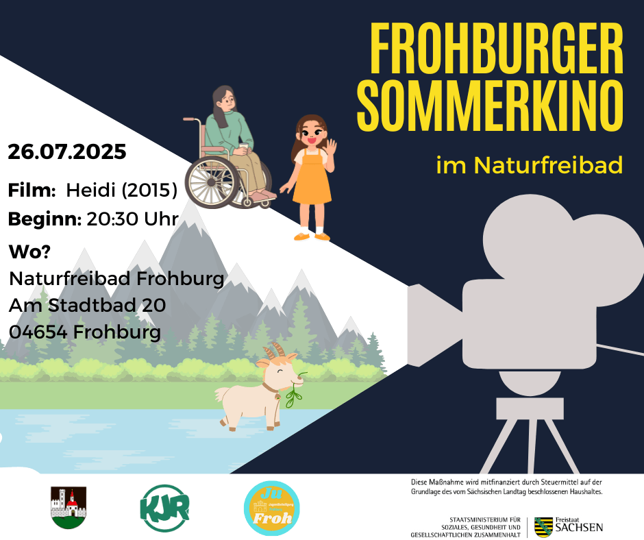 In Frohburg startet, veranstaltet durch die ‚Jugendbeteiligung Frohburg‘ wieder das beliebte Sommerkino-Reihe im Naturfreibad. Den Auftakt macht am 26.7. der Film ‚HEIDI‘, weitere Filme folgen am 2.8. sowie zum Vormerken schon der Termin fürs Frohburger Jugendfestival (JuF-Festival): 23. August.
