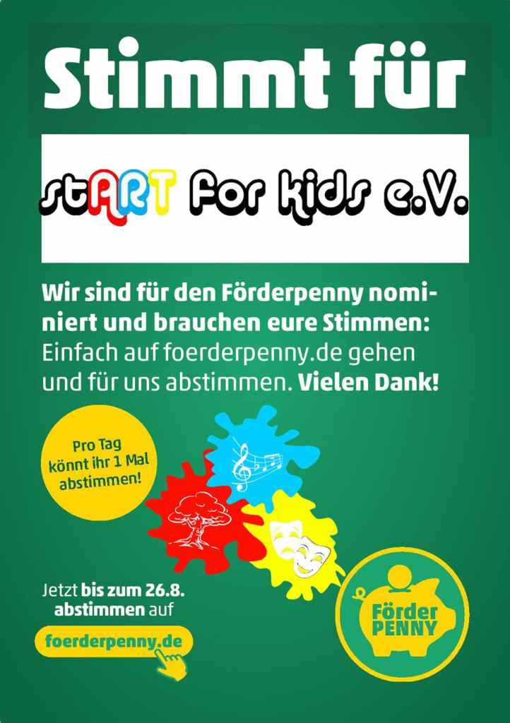 Unser Mitgliedsverein ’stART for Kids e.V.‘ hat eine Spendenkampagne bei Förderpenny gestartet. Unterstützt bis zum 26. August die Arbeit des Vereins mit einem Klick!