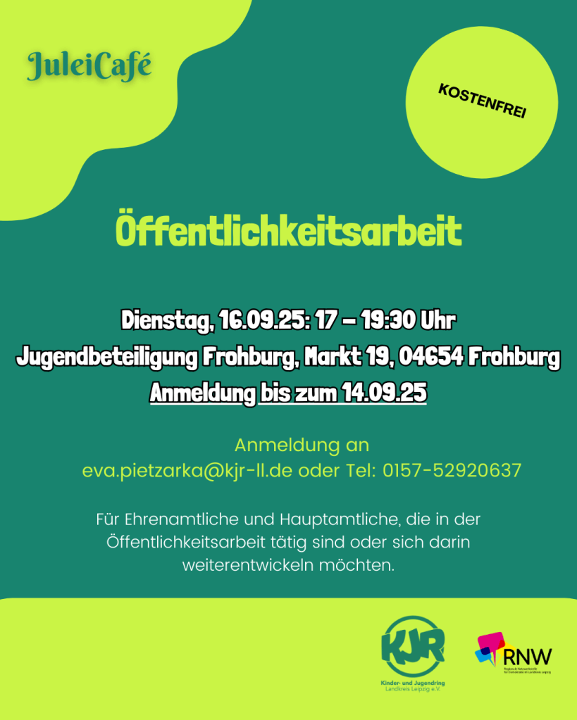 Wir laden euch herzlich zu unserem nächsten JuleiCafé ein – einem offenen und kostenlosen Austausch- und Fortbildungsangebot für alle, die im Bereich der Öffentlichkeitsarbeit aktiv sind oder werden wollen!