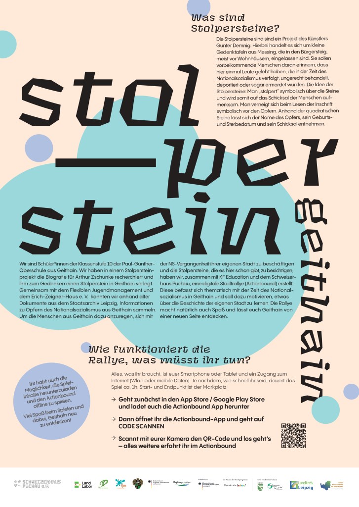 Die Schülerinnen und Schüler der Paul-Guenther-Oberschule haben einen neuen und spannenden Weg gefunden, die kleinen Steine im Stadtbild aufzuspüren: sie haben eine digitale Actionbound – Stadtrallye für Jung und Alt entwickelt. Mit dem eigenen Smartphone oder Tablet werden, wie in einer Schnitzeljagd, die Spieler mit Aufgaben und Rätseln durch Geithain gelotst und erfahren nebenbei viel über die Vergangenheit ihrer eigenen Stadt.