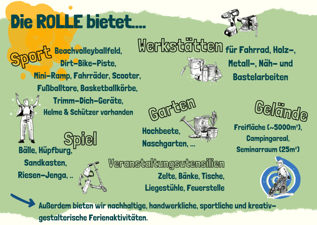 Das ROLLE Gelände kann für Tagesausflüge, Camps o.ä. gemietet und verschiedene Spiel- und Sportutensilien können ausgeliehen werden.
