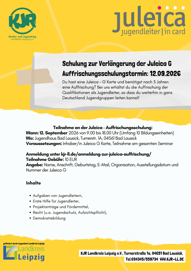 - Voraussetzungen: Teilnahme am gesamten Seminar, Inhaber/in Juleica G Karte
